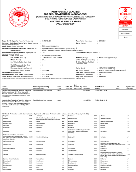 (Laboratuar analizleri ve denetim uygulamalarında İsviçre Merkezli SGS Laboratuvarları çözüm ortağımızdır.)